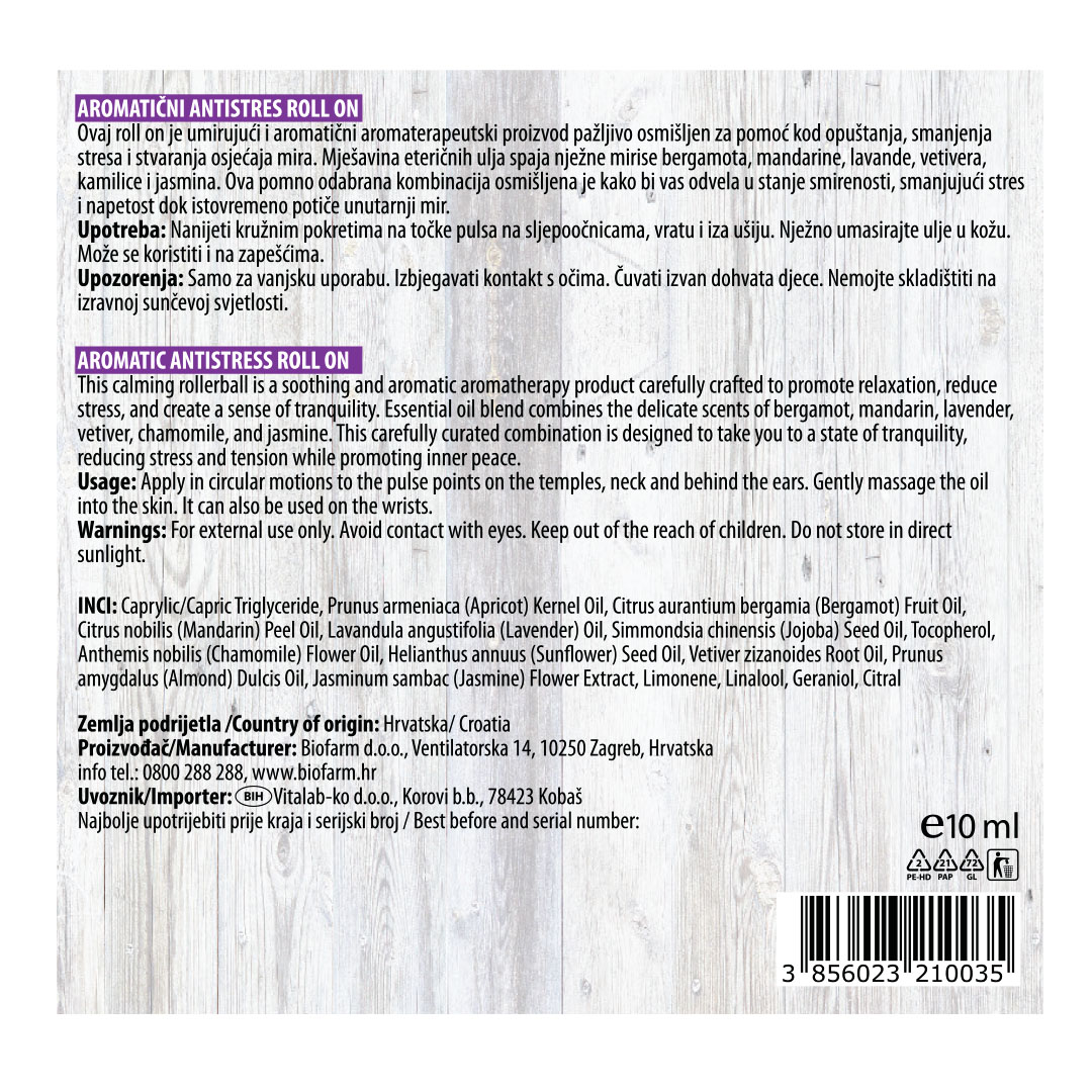 Ovaj roll on je umirujući i aromatični aromaterapeutski proizvod pažljivo osmišljen za pomoć kod opuštanja, smanjenja stresa i stvaranja osjećaja mira. Mješavina eteričnih ulja spaja nježne mirise bergamota, mandarine, lavande, vetivera, kamilice i jasmina. Ova pomno odabrana kombinacija osmišljena je kako bi vas odvela u stanje smirenosti, smanjujući stres i napetost dok istovremeno potiče unutarnji mir.