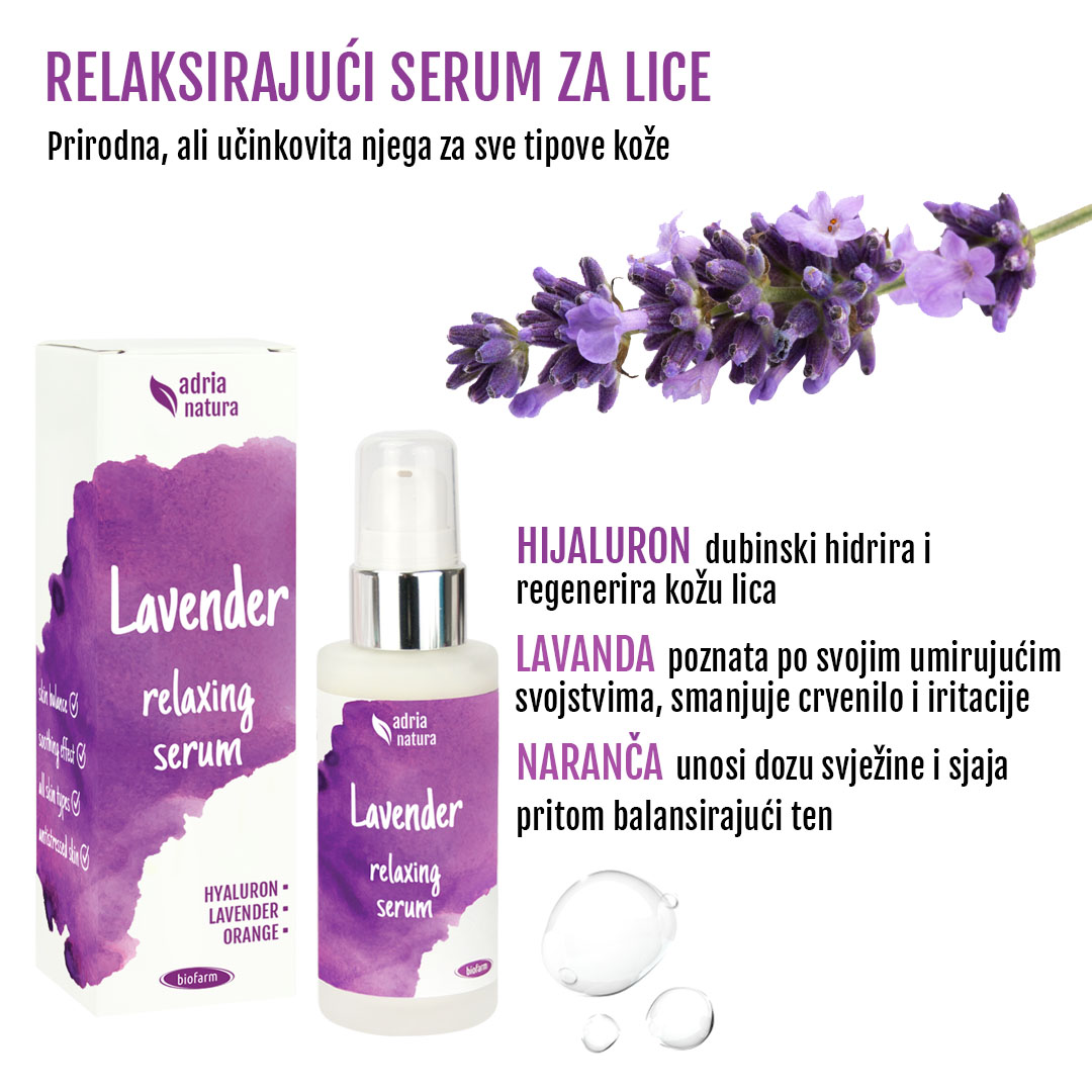 Umirujući serum za svakodnevnu njegu. Hijaluronska kiselina i d-pantenol pružaju koži potrebnu vlagu regenerirajući je iznutra dok eterična ulja lavande i slatke naranče pomažu balansiranju tena. Nježna, ali i učinkovita njega za sve tipove kože.
